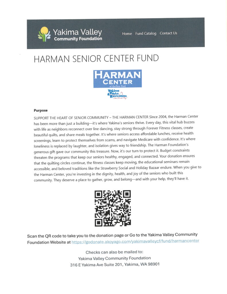 Donate today by scanning the QR code or visiting the Yakima Valley Community Foundation’s Harman Senior Center Fund page: https://godonate.akoyago.com/yakimavalleycf/fund/harmancenter