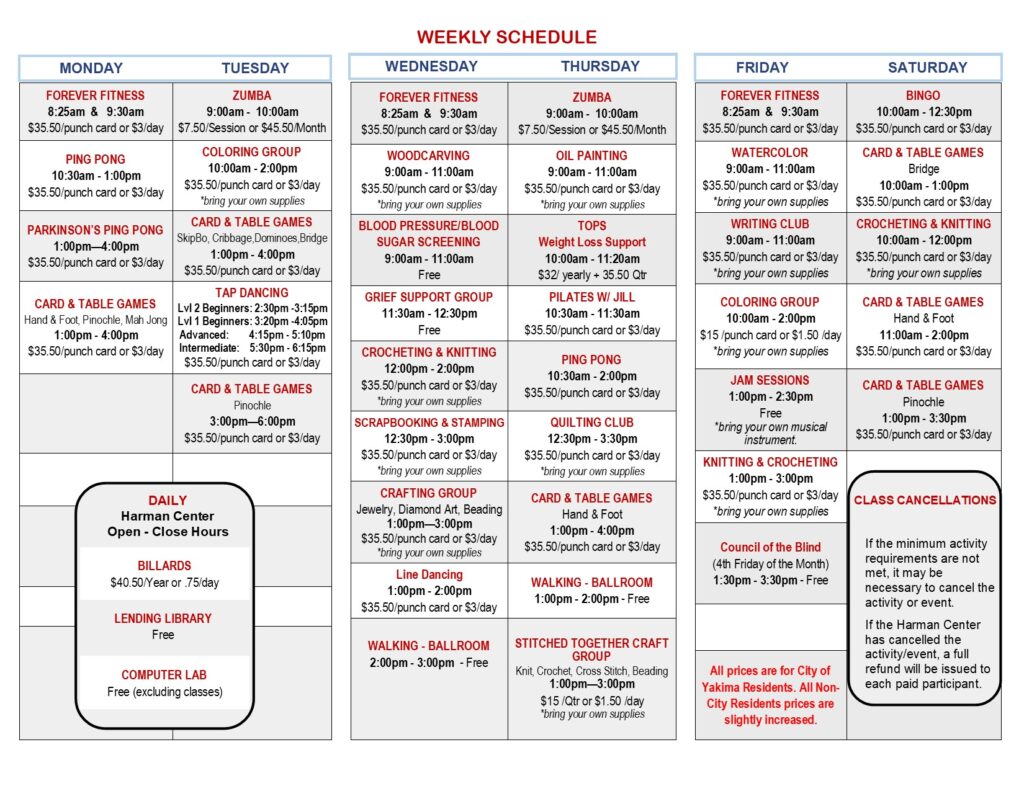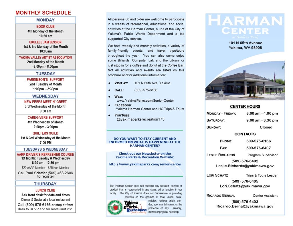 Since 2004, the Harman Senior Center has been the heart of Yakima’s senior community—a place where older adults connect, stay active, and thrive. From fitness and wellness classes to creative arts, educational seminars, affordable lunches, and cherished social traditions, the Harman Center offers programs that promote health, independence, and belonging.