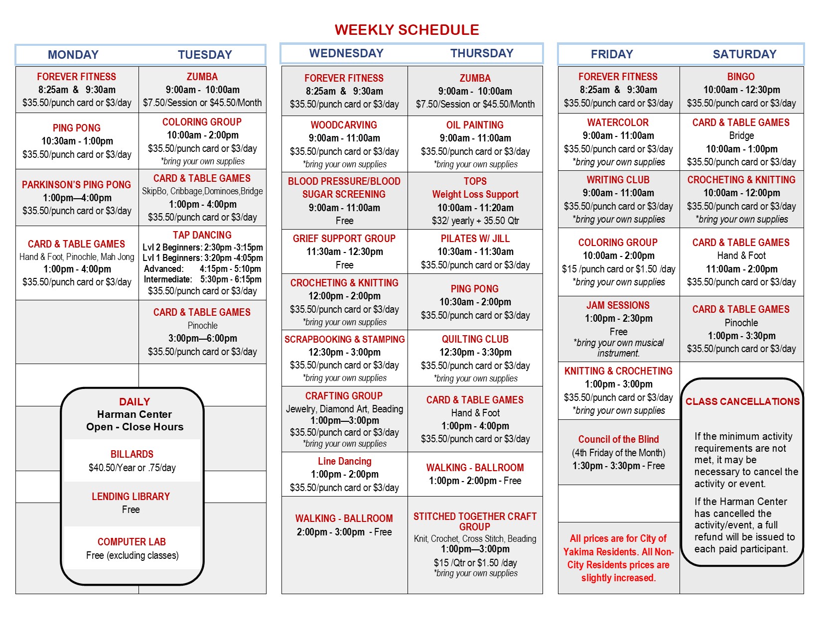 | Ongoing Activities | Billiards/Pool Bingo Bridge Cribbage Dominoes Essential Oils Hand & Foot Mah Jong Pinochle Writing Club | Exercise Classes | Forever Fitness Line Dancing Tap Dancing (Beg/Int/Adv) Zumba |