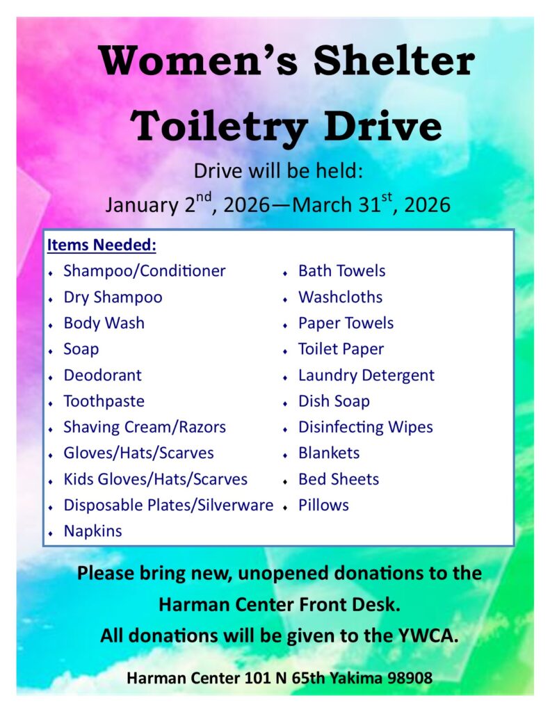Our project this Quarter is gathering new, unopened toiletries for the Women’s Shelter at YWCA from January 2nd, 2026 to March 31st, 2026. Donations will be given to the YWCA. Please click here for the flyer. All donations can be dropped off at the Harman Center Front Desk. For more information, please call (509)575-6166.